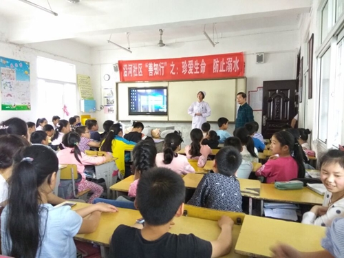 15:00左右,我们便起身前往沿河小学,在五年级二班教室开展小学生防溺水安全讲座,由护理学院团总支实践部部长丁雯妮通过ppt演示和结合自身实例,从了解游泳安全要点、如何预防游泳时下肢抽筋,游泳前一定要做好暖身运动,游泳前应考虑身体状态和夏季游泳溺水自救方略,如何保证游泳的健康和安全,避免溺水事件的发生等方面进行讲述。最后提出防溺水“六不”和四个牢记,同时,在急救护理老师周剑忠的指导下,我们还在现场给同学们做了徒手心肺复苏的整个流程,使他们印象更加深刻。