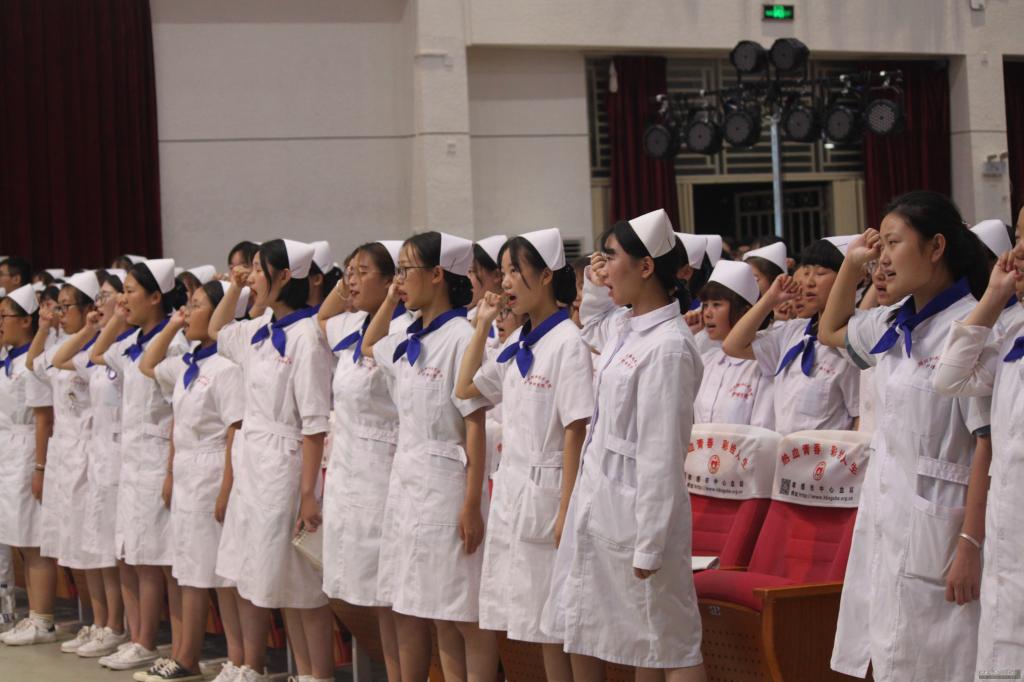 奏唱雄壮的中华人民共和国国歌之后,2019级护理、助产专业全体新生在庄严而神圣的气氛中宣读“南丁格尔誓言”:“我宣誓,自愿学习护理专业,谨奉人道主义精神,坚定救死扶伤的信念,履行护士职责,保护生命,减轻病痛,促进健康……我宣誓:求实进取、勤奋好学、忠于职守、热爱专业,永誌今天的决心与誓言,接过前辈手中的蜡烛,燃烧自己,照亮别人,把毕生的精力奉献给伟大的护理事业!”。接下来,为2018级先进班集体、优秀学生干部、三好学生颁奖,2018级学生代表祝琪、2019级学生代表郭文波、护理学院专任教师田樱老师分别进行发言。