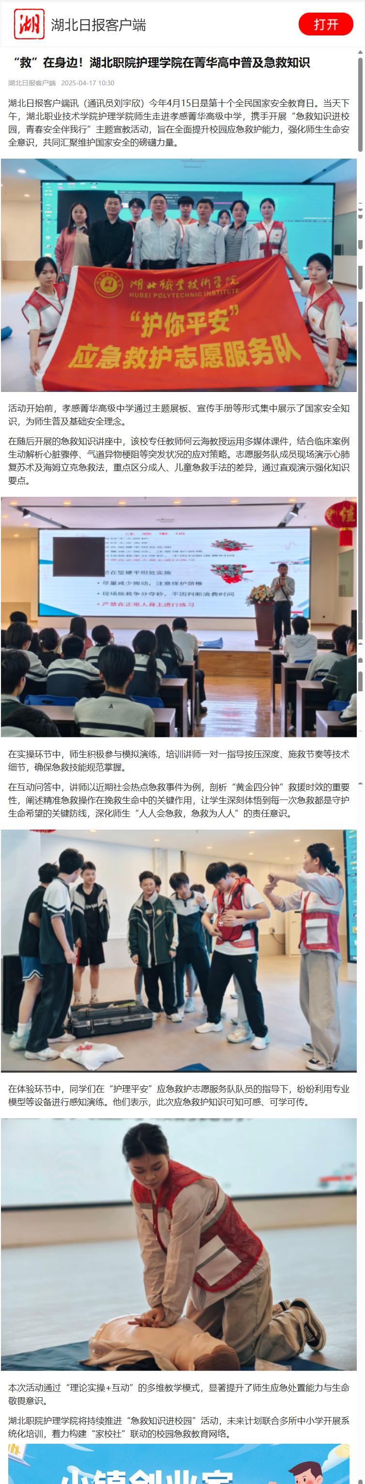 【湖北日报】“救”在身边!湖北职院护理学院在菁华高中普及急救知识