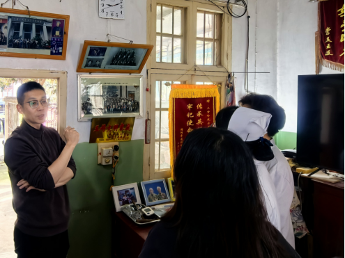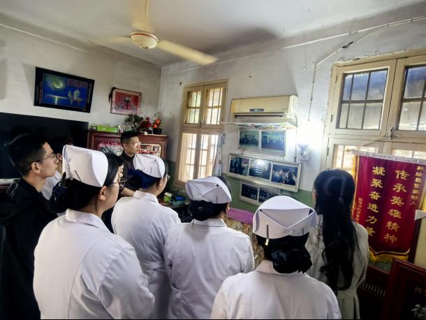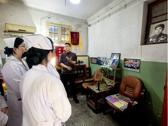 活动中,王清珍老人之孙刘航老师全程陪同师生参观并细致讲述了王清珍老人在战场上的感人事迹。故居内陈列的老照片、荣誉锦旗、旧物件等珍贵史料,生动还原了英雄当年的战斗与生活场景。刘航老师介绍,上甘岭战役期间,坑道内环境恶劣、物资匮乏,王清珍一个人要负责照顾20多名重伤员,既要为伤员清洗伤口、喂药喂饭,还要在炮火中转运伤员、处理危急情况。最令人动容的是,面对排尿困难、生命垂危的伤员,年仅16岁的她毅然俯下身,用嘴吸导尿管帮助伤员排尿,用行动托举生命希望;她还曾为舍身堵枪眼的英雄黄继光整理遗体,用温柔与坚守温暖着每一位战友,用血肉之躯践行救死扶伤的初心使命。