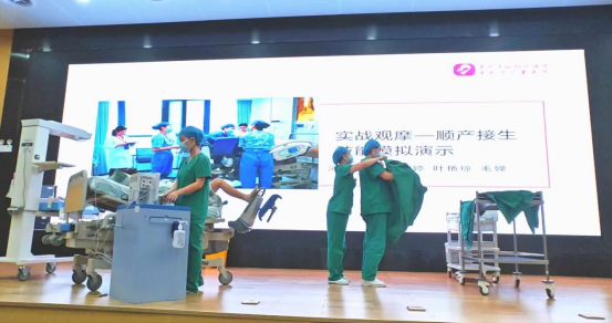 演示中,团队重点展示了贴合临床需求的创新接产技术,生动呈现了“以产妇为中心”的现代化服务模式——助产士全程指导产妇运用拉玛泽呼吸法缓解疼痛、鼓励自由体位选择,配合持续情感支持,并与产科医生、麻醉师、新生儿科医生实时协同,让同学们直观感受多学科协作的重要性。此外,产后延迟断脐、早接触早吸吮等细节演示,更让同学们深刻体会到助产工作对母婴健康的深度关怀。
