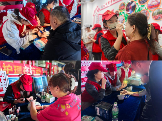 志愿者以细致的筹备工作与精彩的现场表演展现满满诚意。演出前,医美专业志愿者围坐为社区表演者化妆,画笔翻飞间,表演者笑容愈发灿烂,后台满是轻松交流的欢声笑语。正式演出时,台下居民掌声不断,歌曲《一曲万疆颂,同心建文明》,以深情旋律赞颂家国文明;随后,光影剧《青春铸光影,文明共新篇》聚焦“新青年崛起”,从革命时期历史背景切入,用肢体语言展现新青年力量,传递青年担当;最后,舞蹈《跃动青春,共筑文明》则以活力舞姿展现青春风采,为表演画上圆满句号。除文艺表演外,志愿者们还深度参与社区公益市集志愿服务。护理专业志愿者为居民免费测量血压、测血糖并耐心讲解健康知识,以专业技能守护居民健康;此外,医美专业志愿者还开设了“指尖焕彩”美甲服务摊位,结合居民喜好设计款式,细致打造精致美甲,让居民收获美的体验。