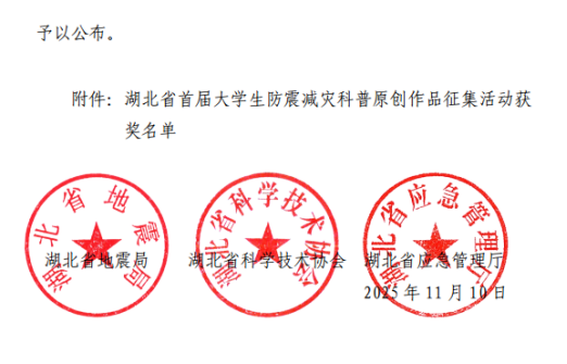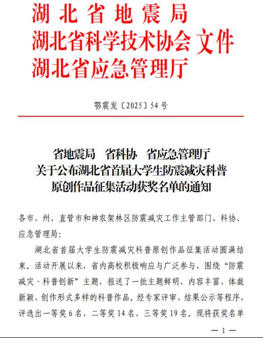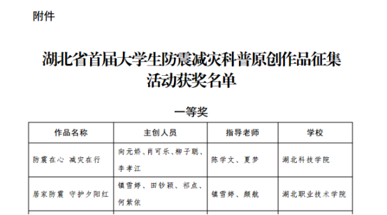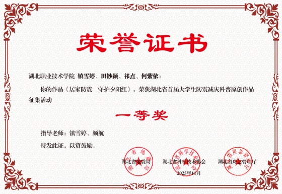 (本网讯:镇雪婷 颜航)近日,由湖北省地震局、湖北省科学技术协会、湖北省应急管理厅联合主办的湖北省首届地震科普大赛圆满落幕。湖北职业技术学院护理学院教师镇雪婷、颜航任指导,智慧健康养老服务与管理专业学生田钞颖、祁点、何紫依组成的参赛团队,凭借“居家防震,守护夕阳红”主题作品脱颖而出,在全省众多参赛队伍中斩获一等奖,充分彰显了我校智慧健康养老服务与管理专业人才培养的扎实成效与科普服务社会的责任担当。