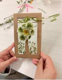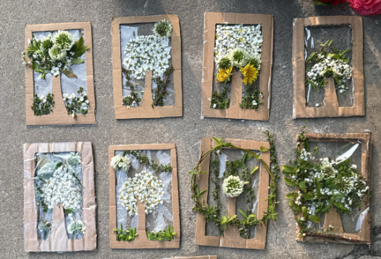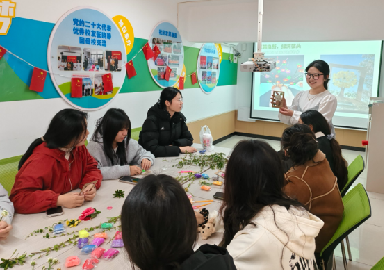 理论学习之后,趣味盎然的手工创作环节拉开帷幕。活动全程秉持低碳环保理念,所用材料均为废弃快递纸箱、校园自然脱落的树叶花瓣,搭配黏土、树枝等简易工具,拒绝采摘活株、杜绝物料浪费。同学们充分发挥创意与巧思,自主选择创作主题,有的以黏土为瓣、树枝为枝,精心捏制出形态各异的树枝花;有的以纸箱为底、花叶为饰,拼贴出春意盎然的开花树。创作过程中,大家相互交流、彼此协作,助教全程贴心指导,现场氛围温馨而热烈。一件件构思巧妙、充满春日气息的手工作品相继完成,不仅展现了同学们的动手能力与创新思维,更将环保理念融入指尖创作,让“绿色低碳” 从口号变为实际行动。