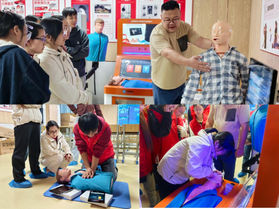 在培训会上,专业讲师王琦以应急救护设备的操作规范与实际应用场景为核心,展开了详细讲解。首先,他现场展示了海姆立克AI技能实训机器人、心肺复苏AI技能实训机器人等先进设备,并通过理论授课与实操演练相结合的方式,带领志愿者们学习了AED使用、心肺复苏、海姆立克急救法等关键技能。随后,在讲师的指导下,志愿者利用仿真人体模型重点练习心肺复苏的按压频率、深度等操作要领,借助智能实训设备实时获取操作反馈,不断修正动作,确保每一个急救步骤都精准规范。参与培训的志愿者纷纷表示,此次培训内容实用、形式新颖,不仅掌握了专业的应急救护技能,更增强了应对突发状况的信心。