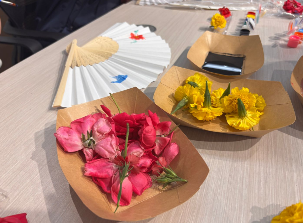 现场活动妙趣横生,氛围温馨融洽。“小老师”们结合学生一站式社区的公共文化氛围,以传统工艺与生活美学为切入点,生动讲述宣纸折扇的历史渊源与工艺价值,详解植物拓印在古代服饰、器物装饰中的应用案例,并通过实物演示科普明矾固色的化学原理:明矾中的铝离子能与植物色素结合,形成稳定的化合物,让拓印图案更持久不褪色。让同学们在了解文化背景的同时掌握科学知识。