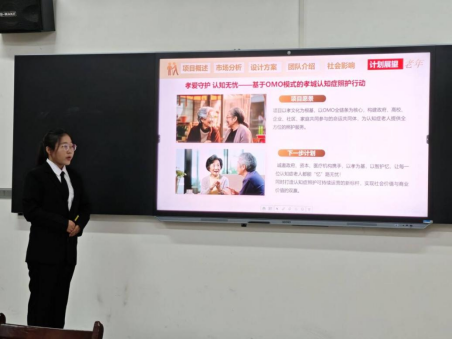 比赛现场,选手们借助ppt声情并茂地讲解方案,诸多项目亮点十足。其中,“孝心护理”“代际乐享”“孝爱守护”项目直击老龄化痛点,三个项目均以“整合资源、精选技能”破局,其研发的智能呼叫器不仅能实时监控老人行为信息,还可联动服务资源实现全天响应派单,结合精细化客户分类,让养老照护更精准高效。此外,还有智能垃圾分类等项目,则分别深耕场景需求、立足专业优势、依托技术创新,精准回应了民生关切,让“科技向善”的理念在现场生动落地。