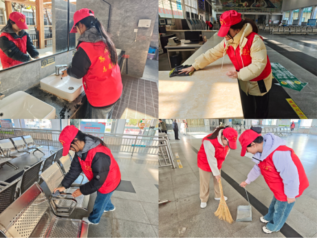 活动伊始,志愿者们迅速按照既定分工投入到了服务工作中,他们以“全方位无死角”为目标,分组对车站候车大厅、检票口及对周边区域开展清洁作业。他们细致擦拭座椅、指示牌表面,清除灰尘与污渍,手持扫帚全面清扫地面散落垃圾,还针对墙角积尘、台阶缝隙等隐蔽死角反复清理,确保无卫生盲区。清扫过程中,志愿者们始终秉持护理专业严谨细致的态度,不怕脏、不怕累,认真清理每一处垃圾,用实际行动为旅客营造洁净舒适的出行环境,经过近两小时的努力,车站整体环境焕然一新,洁净的地面、整洁的设施赢得了过往旅客与车站工作人员的一致称赞。